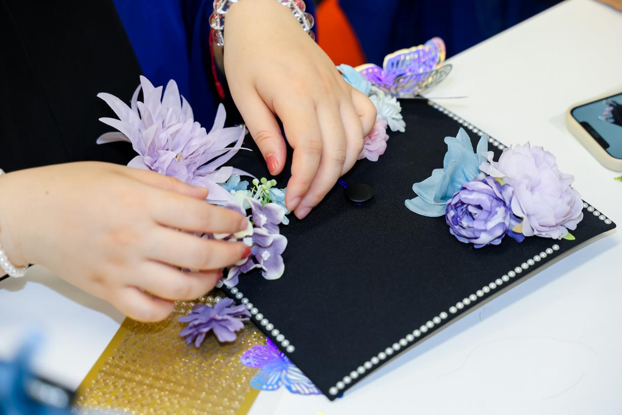 第十八届MBA学生联合会也为毕业生们送上了毕业季国风礼,在硕士帽DIY区域,蝴蝶、花朵、珍珠与云锦花边化作点点心思,被巧手编织成一顶顶独一无二的作品。那不仅是对华师岁月的温柔致意,更是对未来征途的深情许愿。一针一线之间,凝聚的是对品性修养的默默践行,也是艺术之美的内化呈现。内化呈现。