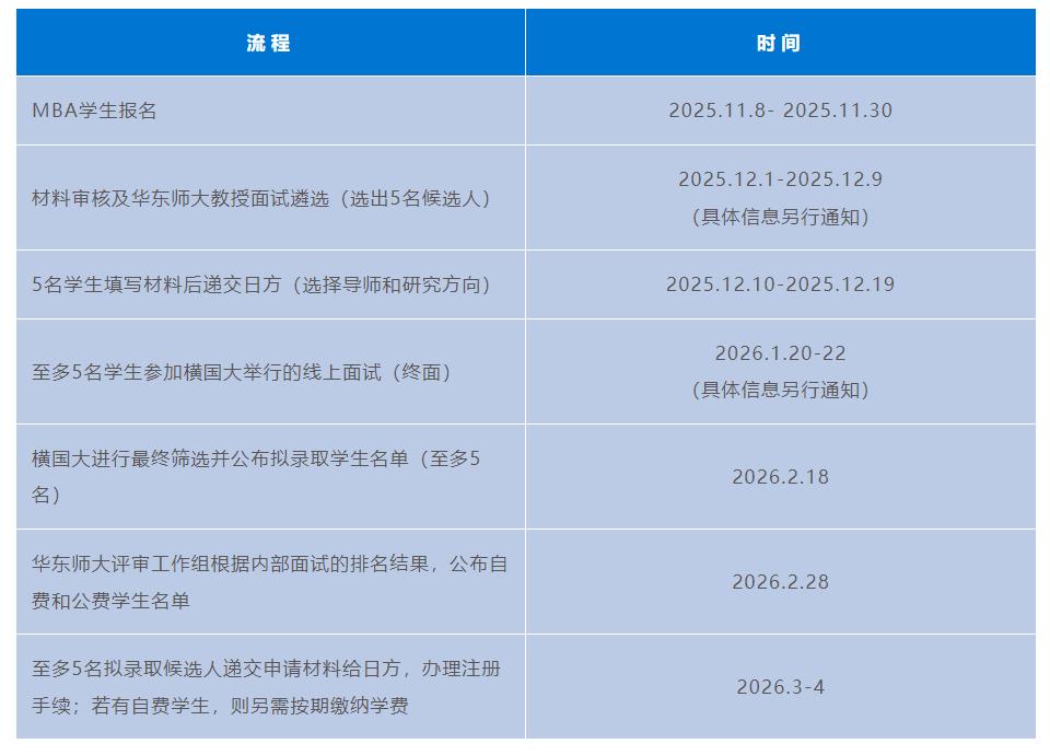 本次双学位项目名额有限,华东师范大学MBA项目2025级及2024级在读学生均可报名。工作组将根据报名情况开展材料审核、面试和录取工作,选拔时间安排如下: