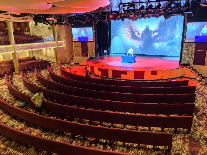 师生们还参观了邮轮的商业区、娱乐区和顶层甲板活动区。邮轮商业生态以“空间价值最大化”为底层逻辑,构建闭环消费场景。2800平方米的“丝路长廊”免税区为游客带来高性价比的购物体验,而国潮专区则通过景德镇瓷器、苏绣屏风等商品在传播中华优秀传统文化的同时实现文化溢价。在娱乐设施中,大都会剧院是核心载体,采用德国SBS舞台系统,单日可完成三场定制剧目演出。作为最重要的公共空间,顶层甲板配备了的篮球场、攀岩区、日光浴休息区、高尔夫球场、水滑道、儿童乐园等休闲、运动设施。