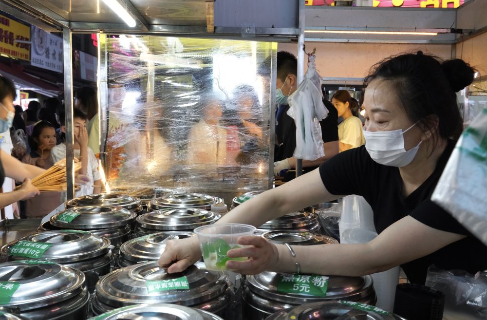 晚上九点,热气散去,从上海来南宁出差的王先生特地赶到埌西夜市打卡。“夜市有卷筒粉、酸嘢和糖水,口味很地道,我和朋友还尝试了螺蛳粉。”他说。