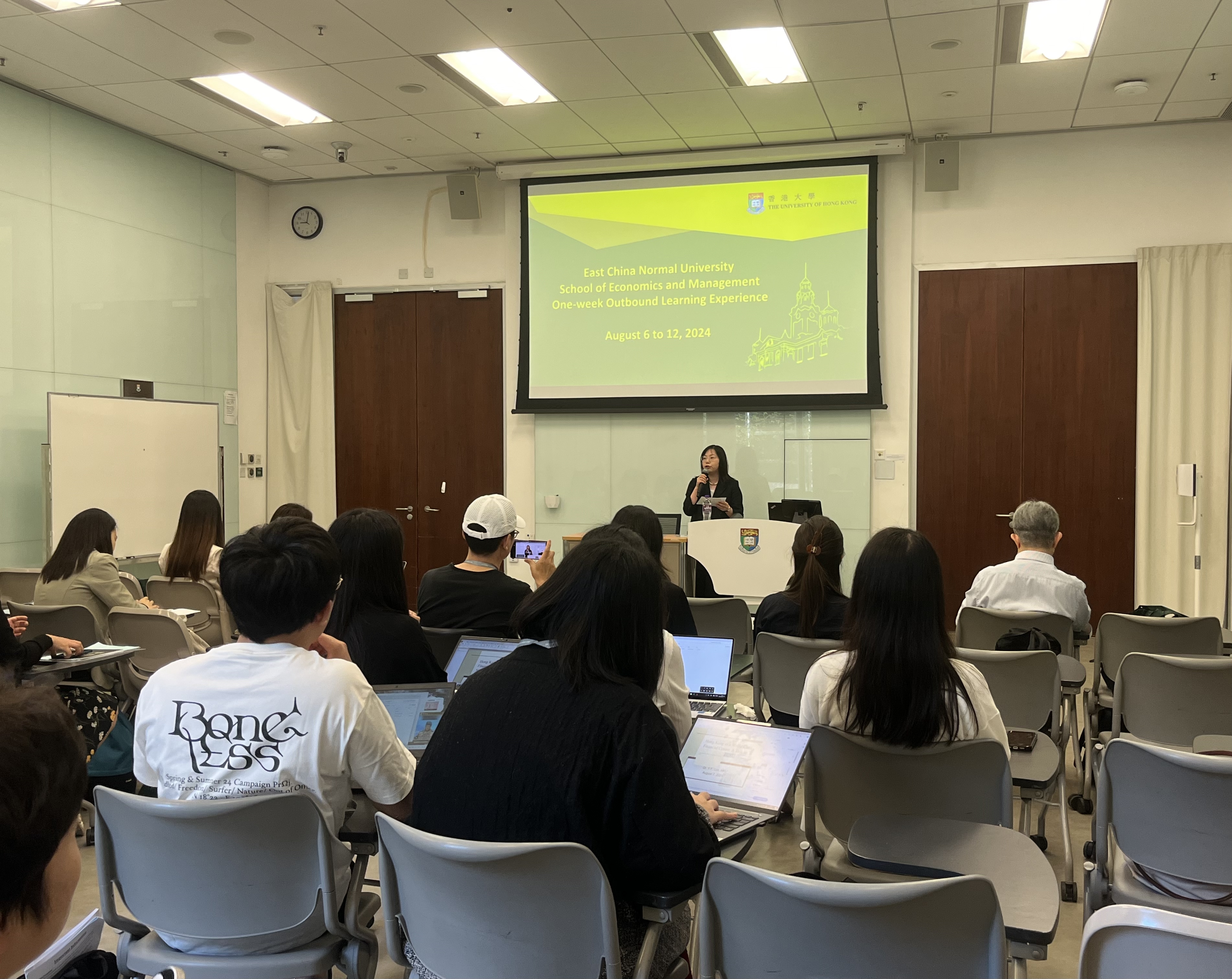 本次研学开班仪式于8月7日早上举行,由香港大学经管学院副院长梁硕玲(Olivia LEUNG)教授首先致辞。她是在会计学和商业管理领域具有深厚学术造诣和丰富教学经验的教育科研工作者。梁教授在开班仪式上详细介绍了本次访学的课程安排和授课团队。本次研学团副团长丁晨燕也代表经管学院致辞,感谢港大各位教授及老师为本次研学活动的贴心付出及日程的精心安排。