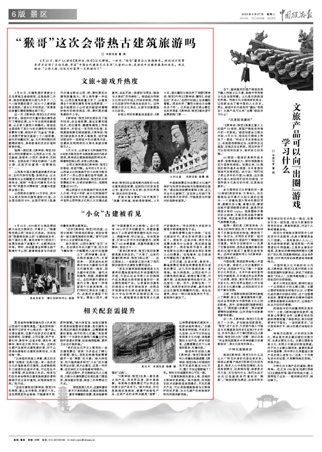 中国旅游报丨《黑神话:悟空》全网霸榜 古建筑旅游会由此成爆款吗?