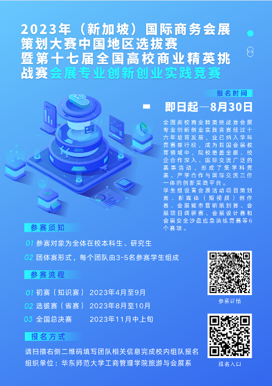 华东师范大学经济管理学院旅游会展系担任该赛道的校内牵头单位,由杨勇、吴文智、张琰、吴杨、陈晓静等组成教师指导团队,为竞赛活动进行了宣传动员和项目指导。2023年8月竞赛活动启动后,开展了校内宣传动员和参赛报名组织。在竞赛辅导阶段,采取了校外专家与校内教师相结合,面上统一指导与项目个别辅导相结合的方法,以赛促学,以赛促创,全面提高参赛队伍的学科水平和创新能力。
