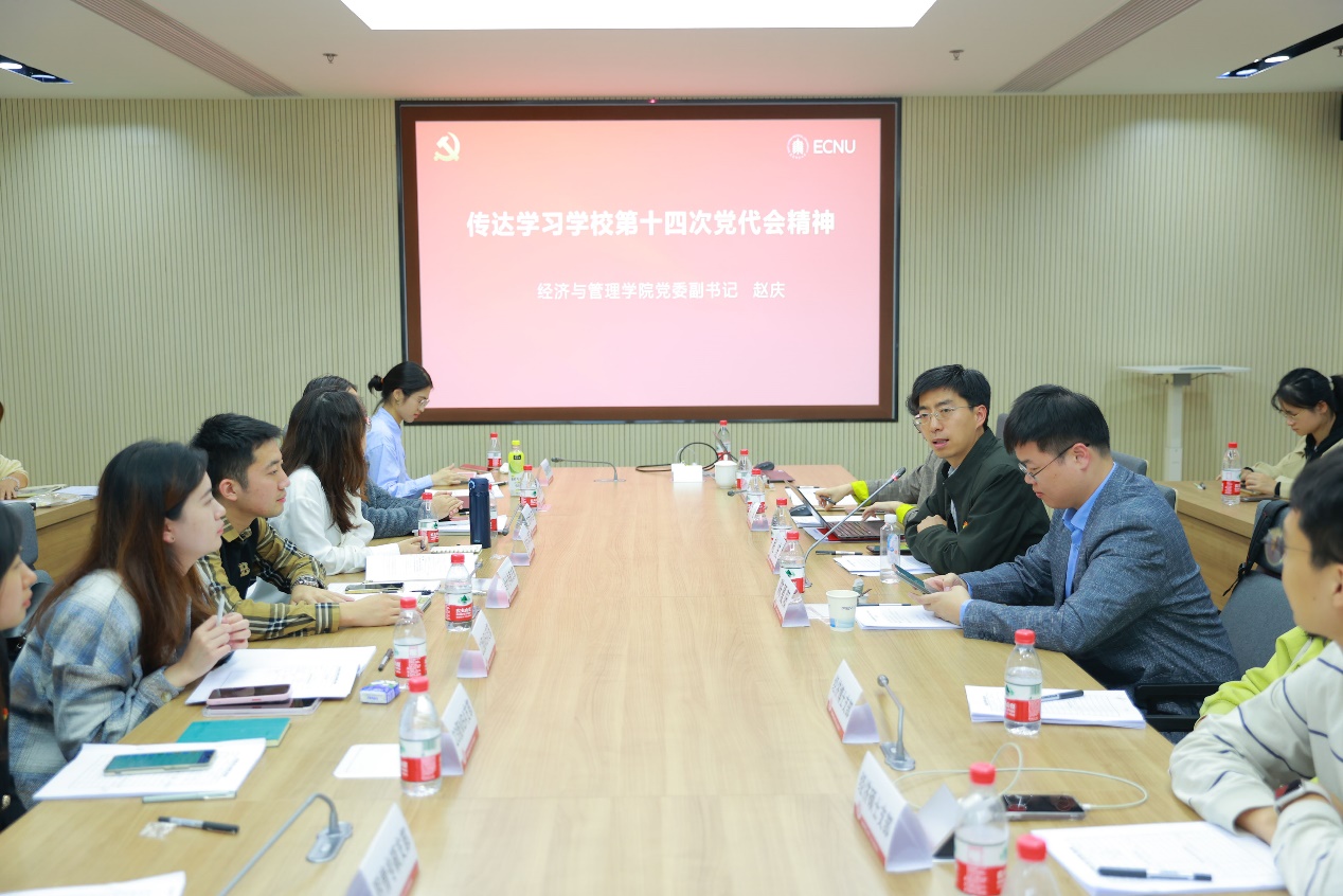 会上,赵庆从会议召开的重要意义、擘画的发展愿景、确立的目标任务等三个方面传达并领学学校第十四次党代会精神。他重点阐释了“三大卓越工程”及“五个一流行动计划”的思路内涵,并希望各学生党支部通过“三会一课”、主题党日活动等方式,紧密结合实际,认真学习宣传、全面贯彻落实会议精神。学院2022级工商管理专硕(MBA)党支部书记王楠作为学生党员代表分享参会感受及学习体会。她结合担任学生党支部书记的经历,表示要把心怀“国之大者”作为思考和谋划工作的逻辑起点,带领支部党员深入开展理论学习,齐心协力提升党支部建设水平,积极响应国家经济社会发展需求。