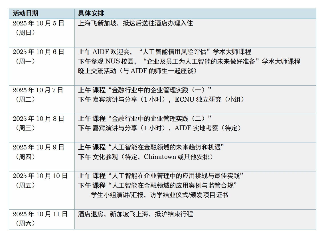 • 具体安排为:2025年10月5日上海出发,前往新加坡(免签证直飞),2025年10月6日至10月10日参加新加坡国立大学亚洲数字金融研究院主办的“人工智能金融管理变革”主题访学活动,其中10月7日下午在新加坡当地开展小组独立研究活动;10月11日启程返回并抵达上海。