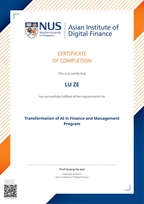 此次新加坡主题访学项目是为经管学院在读学生专属定制的培训项目,所有全程参与访学项目、顺利完成学术课程与企业参访活动、并通过新国立AIDF研究院考核的学生将获得由主办方颁发的课程证书(Certificate of Completion)。该证书是NUS官方颁发的非学历短期培训类证书,可通过NUS官网验证。