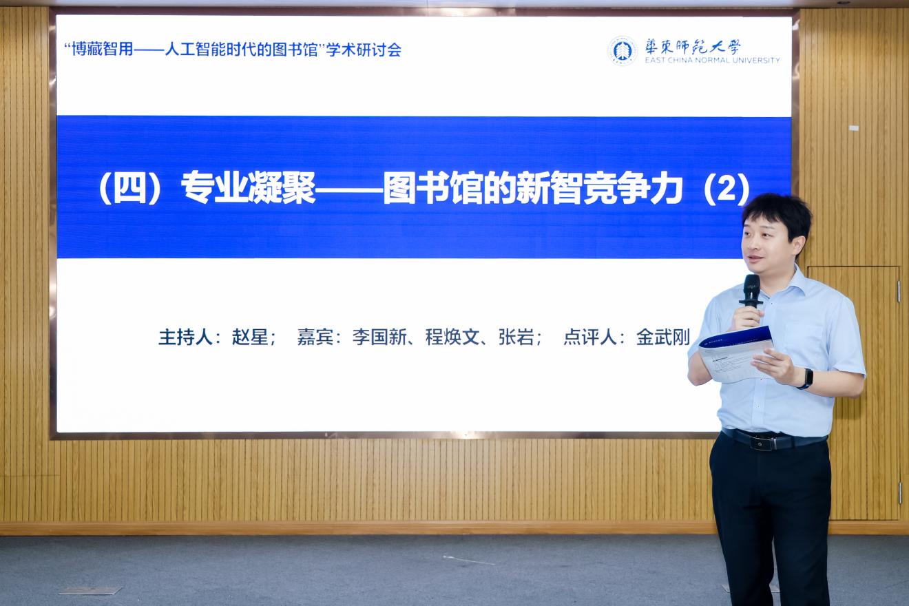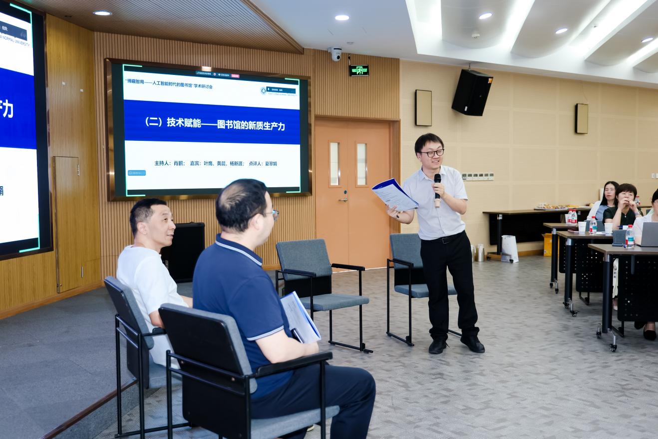 “技术赋能——图书馆的新质生产力”主题的青年学者报告和研讨由南开大学商学院党委副书记、信息资源管理系主任樊振佳主持。南京大学信息管理学院教授赵宇翔聚焦“生成式人工智能驱动下智慧图书馆信息搜索与提示素养培育”,主要讨论了检索、数字素养、提示素养与对话式搜索四大方面。华东师范大学图书馆数据与技术中心主任张毅介绍“智慧涌现服务再造:AI赋能的图书馆新质生产力探索与实践”,针对AI新质生产力与图书馆的战略机遇、AI重塑图书馆核心能力的多元实践、图书馆作为AI枢纽赋能教学科研的生态化整合框架等方面进行深入论述。叶鹰、黄晨、杨新涯针对上述两位研究者的汇报进行点评,对于新一代信息搜索模式、AI素养教育、提示素养、未来教育、数字资源整序、构建中央知识库等问题开展激烈讨论。