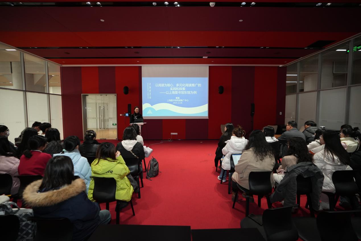 随后,上海图书馆东馆阅读推广中心主任、师大校友夏磊以《以阅读为中心,多元化阅读推广的实践与探索 ——以上海图书馆东馆为例》为主题,分享了在阅读推广方面的实践和探索。夏磊强调,阅读推广已成为公共图书馆的核心服务,东馆以此为核心,积极搭建平台,发挥阅读的最大效应,通过文化、艺术和科学普及推广阅读,稳步推进“大阅读”生态体系的建设。通过一系列活动案例,展示了东馆开馆以来举办的多项阅读推广活动,并分享了这些活动所取得的良好反馈。最后夏磊表示未来要进一步挖掘图书馆的平台效应,以读者需求为导向,发展壮大合作方,并利用好AI赋能阅读推广,践行“人民图书馆”的服务理念。