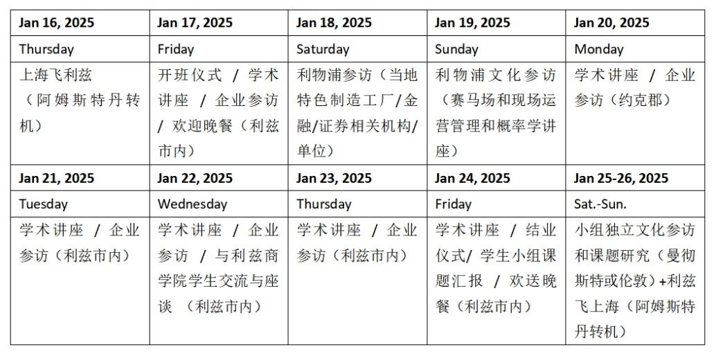 具体安排为:2025年1月16日上海出发,前往英国利兹市(需转机),2025年1月17日至1月24日参加利兹大学商学院主办的“东西方商业动态探究:经济与金融见解之旅”主题访学活动,其中1月18-19日将由主办方安排前往利物浦开展文化参访活动与小组独立研究;1月25日在曼彻斯特或伦敦开展小组独立研究活动(待定);1月26日启程返回上海;1月27日抵达上海。