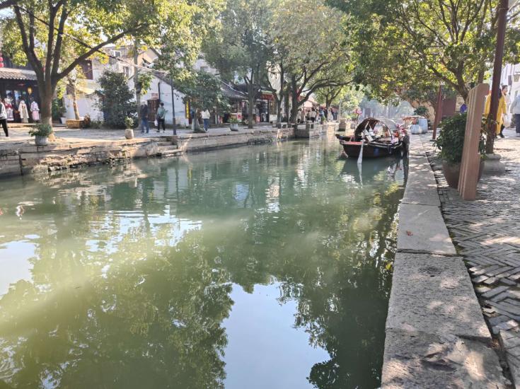 双祥村考察结束后,师生们来到中国历史文化名镇(村)——朱家角古镇。同学们在考察过程中了解了朱家角古镇依靠其丰富的水文与自然资源,在修旧如旧的古镇风貌保护的前提下,深入挖掘江南水乡古镇文化,将文化寓于单元化的旅游产品当中,将单元化的旅游产品串联成可闭环、可赋能、可叠加的旅游精品集群。同时,用发展规划规范老街业态,既保证了古镇传统生活场景的固态延续,又能实现产业、文化、旅游的更新融合。