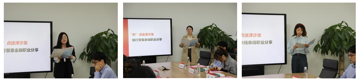 中国工商银行上海市分行的青年团员代表分别作银行普惠金融、零售条线、市场条线的职业分享,揭开银行业务的面纱,激发学生职业生涯规划,为经管学子“职”点迷津,照亮前行之路。