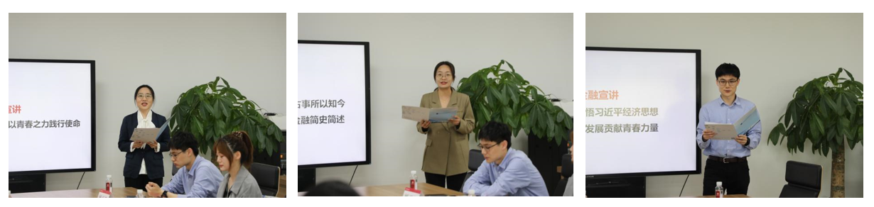 中国工商银行上海市分行成员带来生动且精彩的红色金融文化宣讲。解仲彗作《实学实干,以青春之力践行使命》宣讲,鼓励青年不忘初心,以青春之能量,为党的事业、国家发展增添不竭动能。宋婉婷作《明镜所以照形,古事所以知今——中国红色金融简史简述》宣讲,介绍中国近代的无产阶级革命史,梳理贯穿其中的红色金融史。顾雨聪作《学思践悟习近平经济思想,为经济发展贡献青春力量》宣讲,结合自身的银行工作经历,深入探讨习近平新时代中国特色社会主义经济思想。