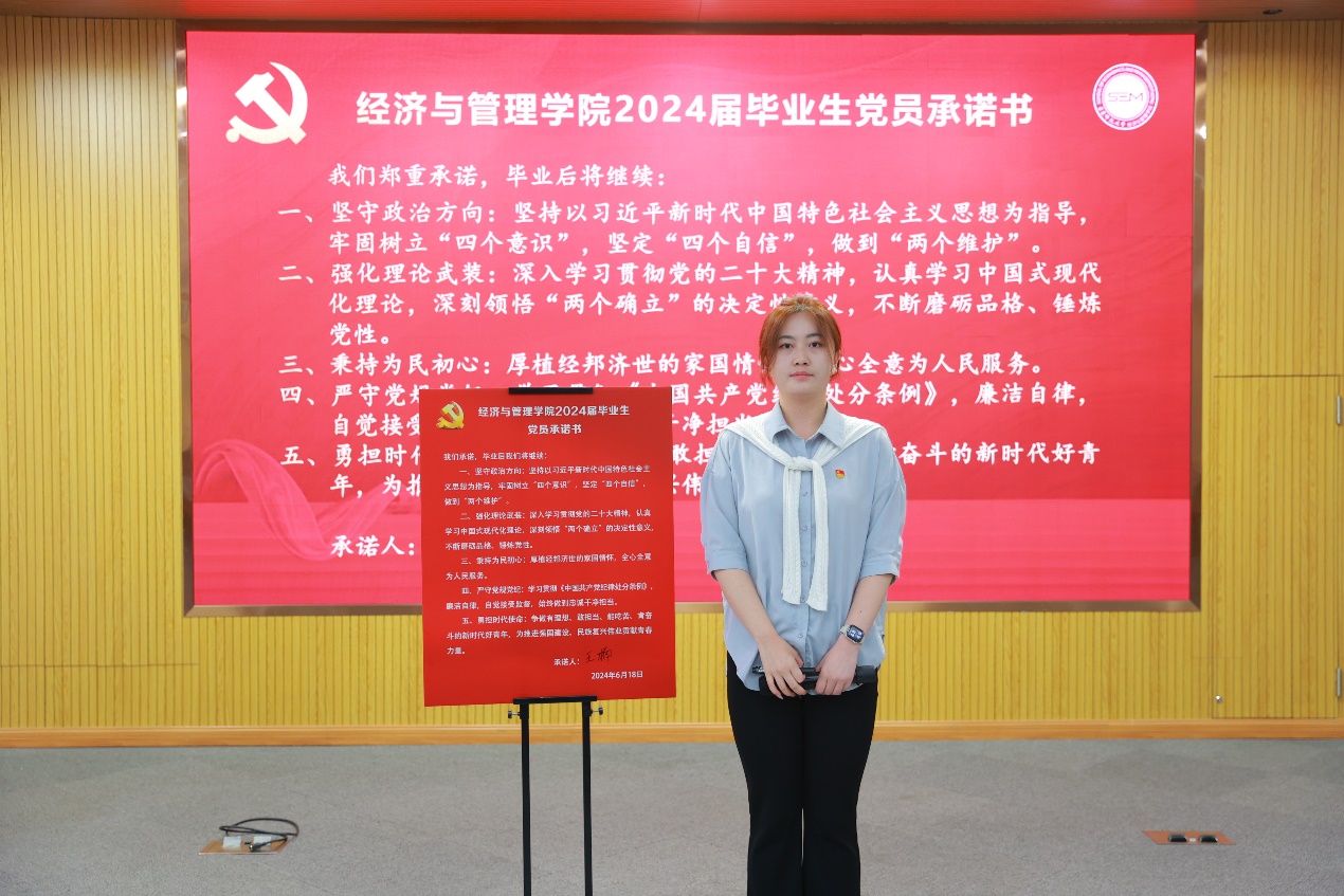 2022级工商管理专硕(MBA)党支部书记王楠代表全体毕业生党员郑重承诺并签订承诺书