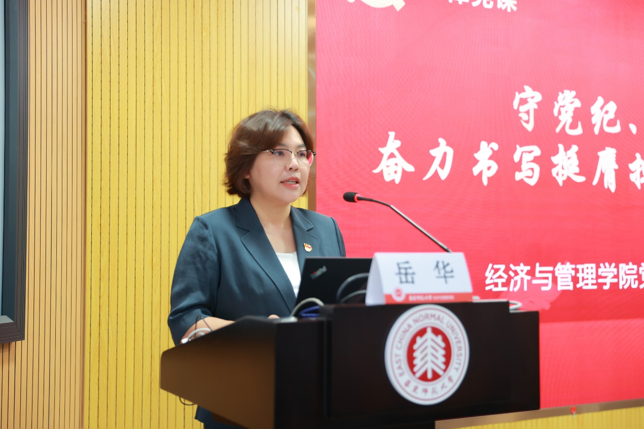 岳华讲题为“守党纪、做表率,奋力书写挺膺担当的青春篇章”的纪律党课,从“学纪知纪,筑牢理想信念的总根基”“胸怀天下,坚守经邦济世的家国情”“明纪守纪,书写挺膺担当的新篇章”三个方面出发,结合党纪学习教育要求,引用我国国际金融学科的创始人陈彪如先生,大夏大学校友、经济学家、教育学家郭大力先生等前辈楷模的典型事迹,勉励毕业生党员悟大道、成大事,努力成为强国建设的有用之才、栋梁之才。岳华指出,党纪是每位党员每时每刻必须要坚守的总规矩,是共产党人永葆初心使命的必然要求。她希望毕业生党员真正把党的纪律规矩记于心、践于行,严守党纪、勇当先锋、争做表率,在推进强国建设、民族复兴伟业中彰显青春风采、贡献青春力量。