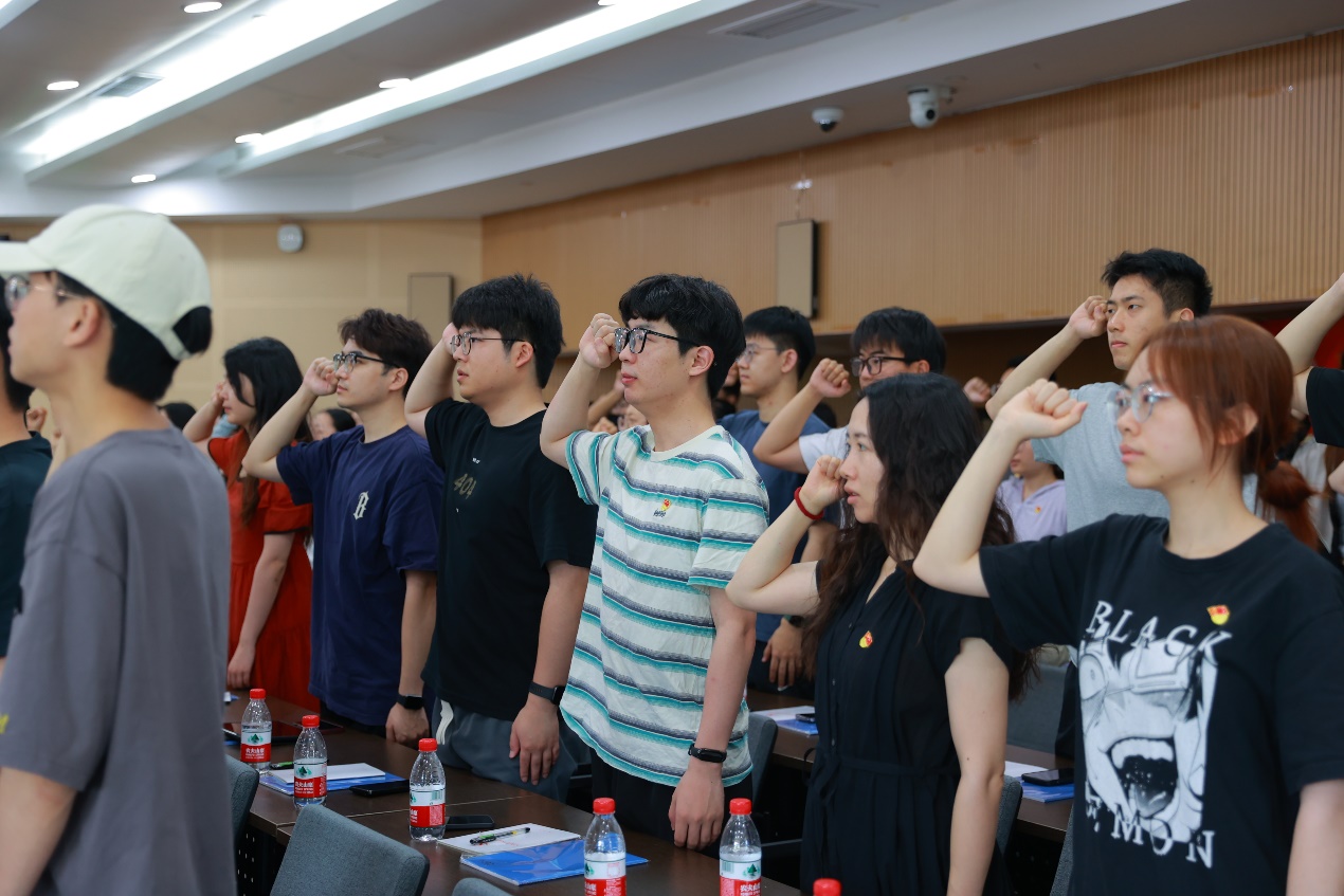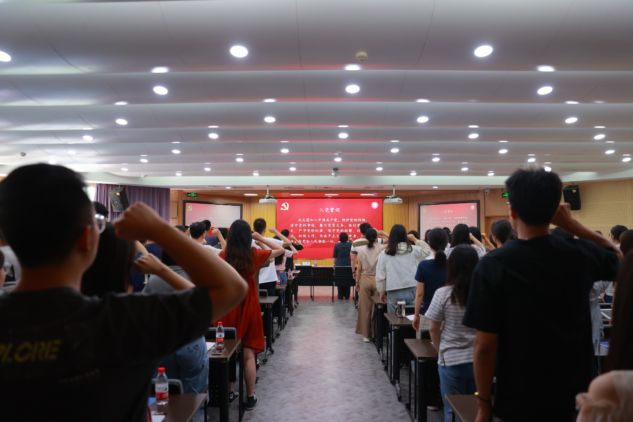 在赵庆的带领下,全体毕业生党员面向党旗、举起右拳,庄严宣誓。“我志愿加入中国共产党,拥护党的纲领,遵守党的章程,履行党员义务……” 宣誓声坚定有力,激励在场每一位党员坚定政治信念,不忘初心、矢志奋斗。