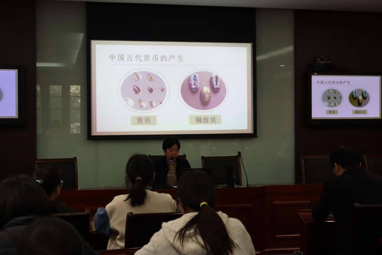 随后,负责人讲师向师生详细讲述了我国数千年的经济发展史、文明演进史与货币史之间的相互影响,内容涵盖了从先秦时期的贝币、刀币,到方孔圆钱与纸币,再到近代的机制银元及人民币的演变历程。此外,讲师还深入科普了钱币铸造技术的变迁,从古代传统的浇铸工艺到现代高精度激光雕刻等防伪技术的演进。
