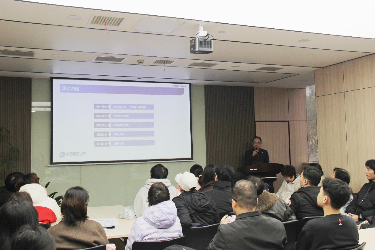 活动初始,申万宏源证券有限公司北京西路证券营业部副总经理俞震对师生一行表示热烈欢迎,并详细介绍了申万宏源的发展历程。师生通过观看宣传片,进一步了解了申万宏源的历史沿革、业务布局和发展成就。