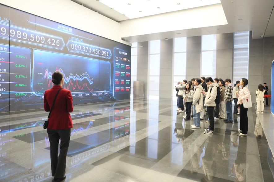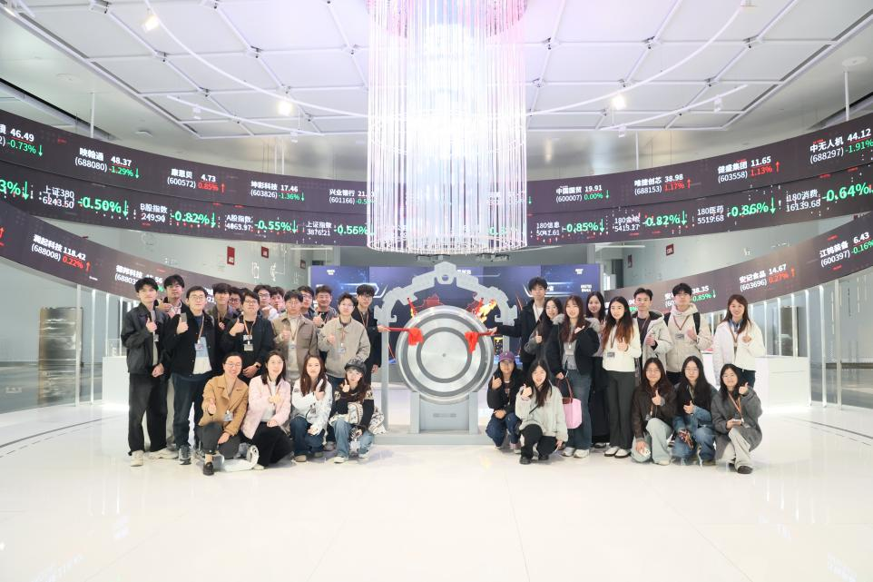 首先,师生们步入上海证券交易所投资者教育基地,映入眼帘的是一块实时显示沪市行情的大型显示屏。通过观看上交所宣传片,同学们初步了解了上交所的发展历程与战略目标,深刻感受到其致力于建设全球一流交易所的宏伟愿景。