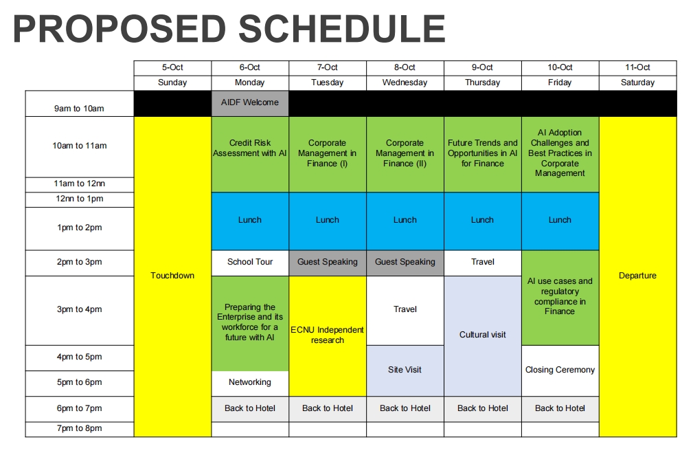 • 具体安排为:2025年10月5日上海出发,前往新加坡(免签证直飞),2025年10月6日至10月10日参加新加坡国立大学亚洲数字金融研究院主办的“人工智能金融管理变革”主题访学活动,其中10月7日下午在新加坡当地开展小组独立研究活动;10月11日启程返回并抵达上海。