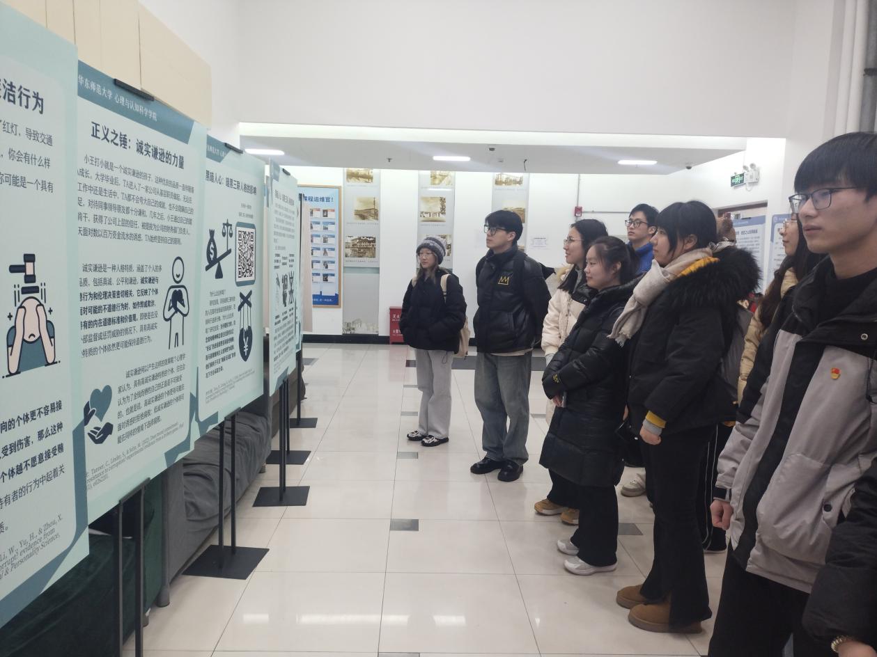 随后,全体支部党员移步至大学生活动中心一楼参观“廉心洁行”华东师范大学廉政心理科普展。展览分为“心智探秘:认知与廉洁同行”“社会镜像:环境塑造的廉政风貌”“千人千面:个体差异与腐败心理”“智慧之光:心理学赋能反腐倡廉”四大板块,通过丰富的图文资料、互动体验和多媒体展示,从科学心理学角度分析了廉政心理认知机制,深入探讨了如何运用心理学方法与技术防范腐败行为,旨在提升党员们的廉政意识和心理素养。