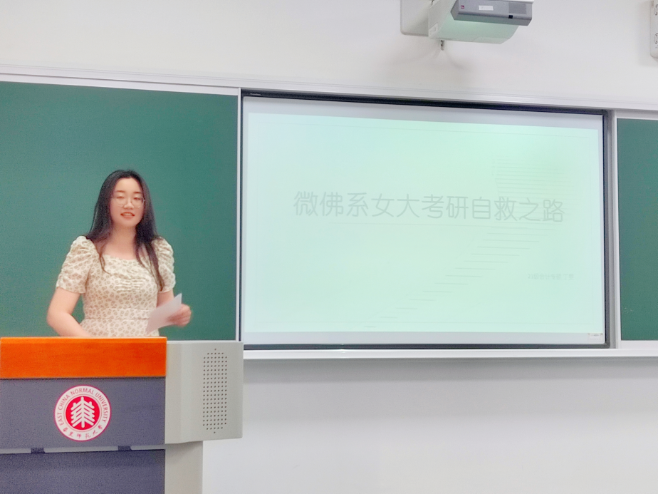 2020级会计学本科蔡卓君主要为同学们分享了自己跨考北京大学法学硕士的经验,首先她分享了自身选择备考法硕的心路历程,向同学们介绍了考研的整个流程,随后分享了自己在英语、政治、专业课上的备考经验。她强调计划的重要性,建议在备考初期制定每个阶段的计划,尽可能完成不同阶段应该完成的任务,掌握自己的节奏,以此避免学习中的焦虑情绪,放平心态提高效率;理性选择机构或者学长学姐辅导,冲刺阶段理性对待押题,同时还要注意备考期间的身体健康,最后冲刺阶段身体状态对学习和成绩有着重要影响。